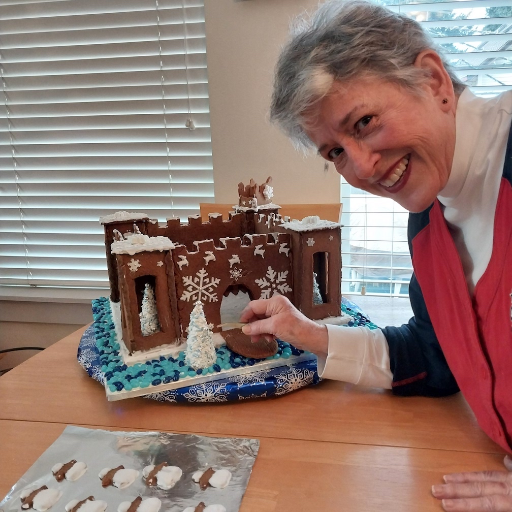 But these days one of the best parts for Kuhlman about working on her annual gingerbread house is that it isn’t a solo effort. For eight years running, one of her sisters, Marie Hastings, rides the Amtrak up from Oregon every November so that the two of them can collaborate on a gingerbread project. They go over Kuhlman’s design ideas, make adjustments, mix up the dough, and use tried-and-true pattern pieces to cut out the necessary shapes. They bake and trim the pieces, then use tinted royal icing to “cement” the gingerbread edifice together before finalizing the detailed decorating.