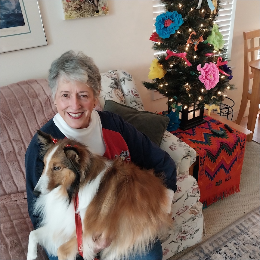 Wearing red-and-white polka-dotted bows behind her ears, Gracie looks fetchingly festive. Her post-bath embellishment won’t last long, because Gracie is a self-respecting Shetland Sheepdog. But she puts up with it for a little while in order to please her human, Dawn Kuhlman.
