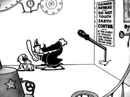 Moldering on my refrigerator door is a browned 3-by-4-inch newsprint clipping of a single frame from Max Fleischer’s animated cartoon “KoKo’s Earth Control”, dated (c.) 1928. In the frame, KoKo the clown is lecturing his dog Fitz about the huge lever imbedded in the wall behind him below a sign proclaiming, “Danger, beware, do not touch earth control! If this handle is pulled, the world will come to an end!”